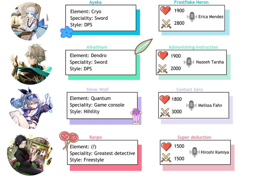 | Death Note, AOT, BSD, Demon Slayer | Danganronpa, Doki Doki, any Mihoyo game at this point, Batman series |